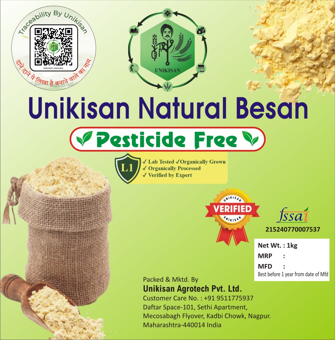 Unikisan Natural Besan L1 is premium-quality gram flour made from naturally grown desi chana, cultivated with Unikisan partnered farmers under the expert supervision of our agronomist team and powered by Unikisan.AI advisory platform.